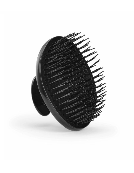 Hiustenpesu- ja hierontaharja, nailonharjakset pyöristetyillä päillä, musta. Auttaa shampoon levittämisessä hiuksiin ja päänahkaan samalla hieroen päänahkaa.