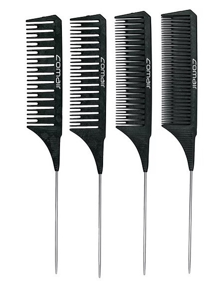Hiilikuitukampasetti – 10, 15, 20, 30 hammasta, 22 cm Tämä kampasetti sopii erinomaisesti valkaisu- ja värjäystekniikoihin. Setti sisältää 4 kampaa, joissa on 4 eri piikkitiheyttä, jotka varmistavat tarkan värin levityksen ja tasaisen tuotteen jakautumisen. Kammat on valmistettu erittäin kestävästä ja pitkäikäisestä materiaalista, ja niitä täydentää metallinen hiustenerotin tarkkaa osittelua varten. Suunniteltu käytettäväksi jopa 150 °C:n lämmössä ja kestävät happoja ja emäksiä, joten se on ihanteellinen valinta paljon käytettyihin kampaamoihin. Lisäksi antistaattiset ominaisuudet estävät hiusten tarttumisen kampaan, mikä helpottaa työskentelyä.