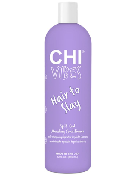 CHI Vibes Hair to Slay Split End Mending Conditioner sisältää kaksihaaraisia korjaavia sideaineita, jotka auttavat korjaamaan lämmön, valkaisun, värjäyksen ja päivittäisen hiustenpesun aiheuttamia vaurioita.