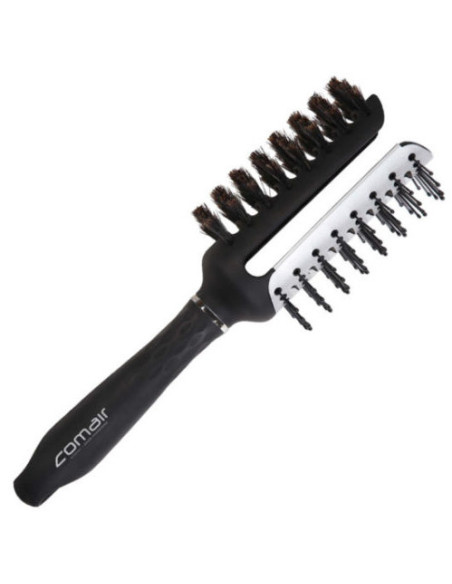 Kaksipuolinen, pyöreä hiusharja, jossa on villisian harjakset toisella puolella ja nailonharjakset toisella puolella. Muovirunko pehmeällä pinnalla mukavan otteen takaamiseksi.