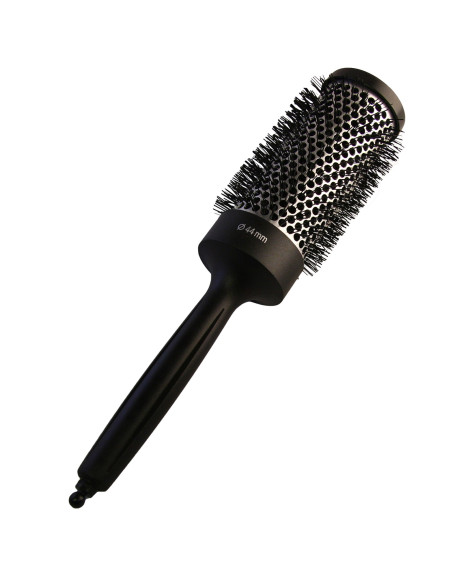 Hiusharja Termo. Harjan varren takaosassa on muovinen tappi, jota voidaan kääntää ja käyttää hiusten erottelemiseen. Halkaisija: Ø44 mm