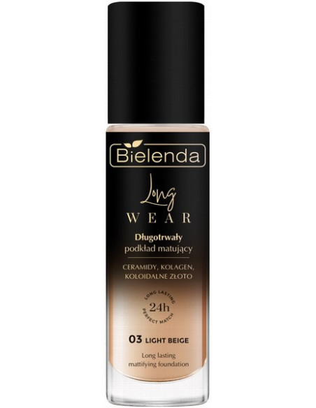 Bielenda Long Wear Foundation -meikkivoide antaa erinomaisen mattapeiton, joka kestää jopa 24 tuntia. Meikkivoide antaa luonnollisen ja tasaisen ihonsävyn ja samalla vähentää merkittävästi epätasaisuuksia ja juonteita. Sen kevyt koostumus antaa kevyen tunteen ja ylläpitää ihon mukavuutta koko päivän. Vedenkestävä. Ei leviä. Käyttö: Ravista. Levitä meikkivoidetta tasaisesti iholle sormenpäillä, meikkisiveltimellä tai sienellä.