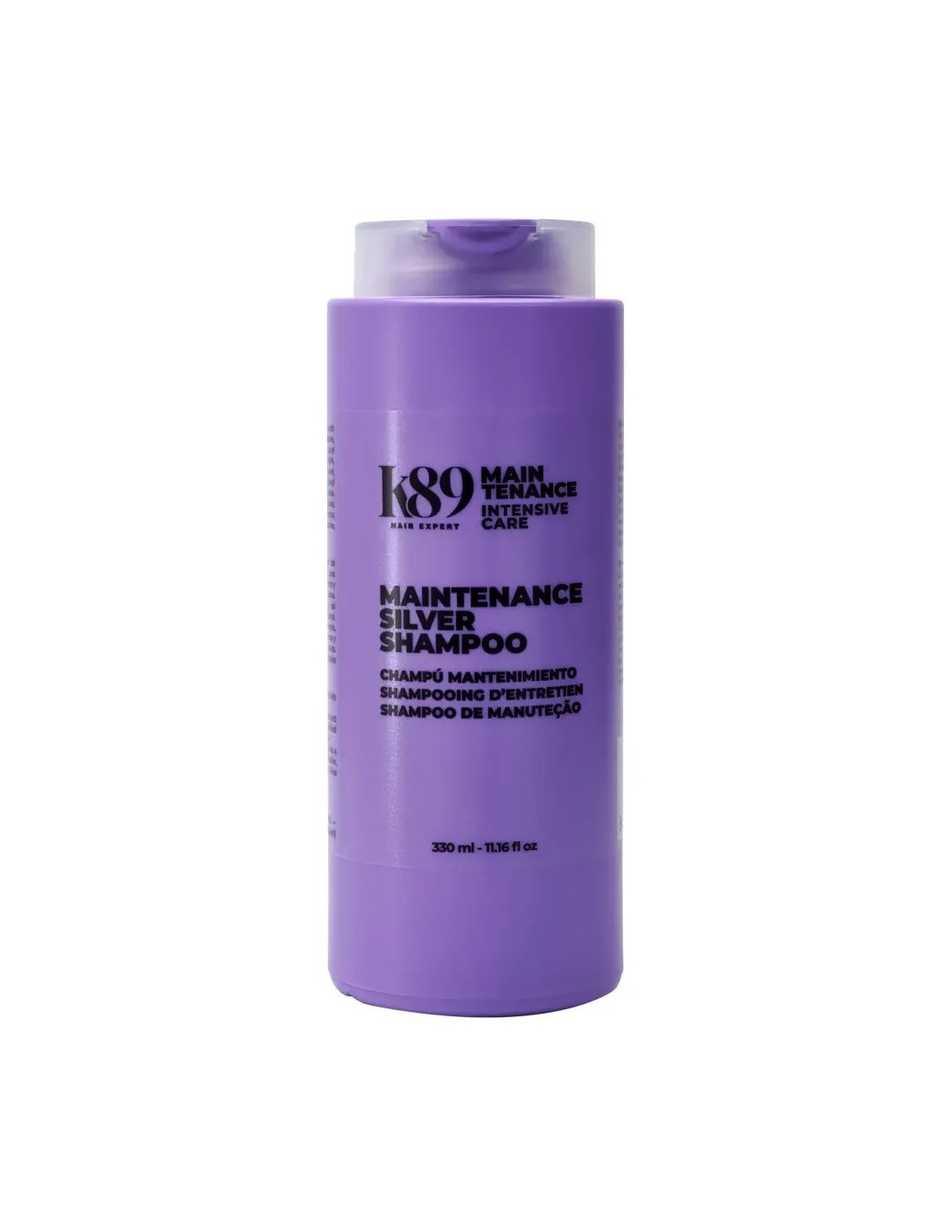 K89 Intensive Care Maintenance Silver -shampoo, jossa on violetteja mikropigmenttejä, jotka neutraloivat vaaleiden hiusten ei-toivotut keltaiset ja kullanruskeat sävyt. Se on täydellisesti tasapainotettu varmistamaan pitkäkestoisen vaikutuksen tehohoitokäsittelyjen aikana. VAIKUTTAVAT AINEOSAT: Hydrolysoitu keratiini: uudelleenjärjestelee ja hoitaa hiuksia. Macadamiaöljy: täydentää hiustuppia palmitoleiinihapolla, palauttaa hiukset ja ehkäisee pörröisyyttä. Suolaton Sulfaatiton Pidentää tehohoitokäsittelyjen kestoa Puhdistaa syvältä Käyttö: Levitä shampoota kosteisiin hiuksiin, hiero kevyesti ja huuhtele. Tilavuus: 330 ml