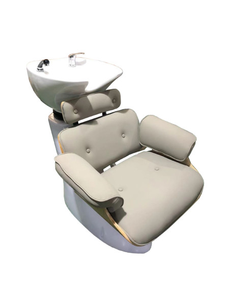 Parturi-kampaajan pesuallas. Tuolin väri on hopea, pylvään väri on valkoinen, keraamisen altaan väri on valkoinen. Säädettävä altaan kallistuskulma: ylös - alas. Tuoli on verhoiltu erityisellä ekonahalla. Vesiliitäntä: pylvään pohjasta tai takaa. Mukana: niskatuki, hana, vesisuihku joustavalla letkulla, joustava vedenpoistoputki.